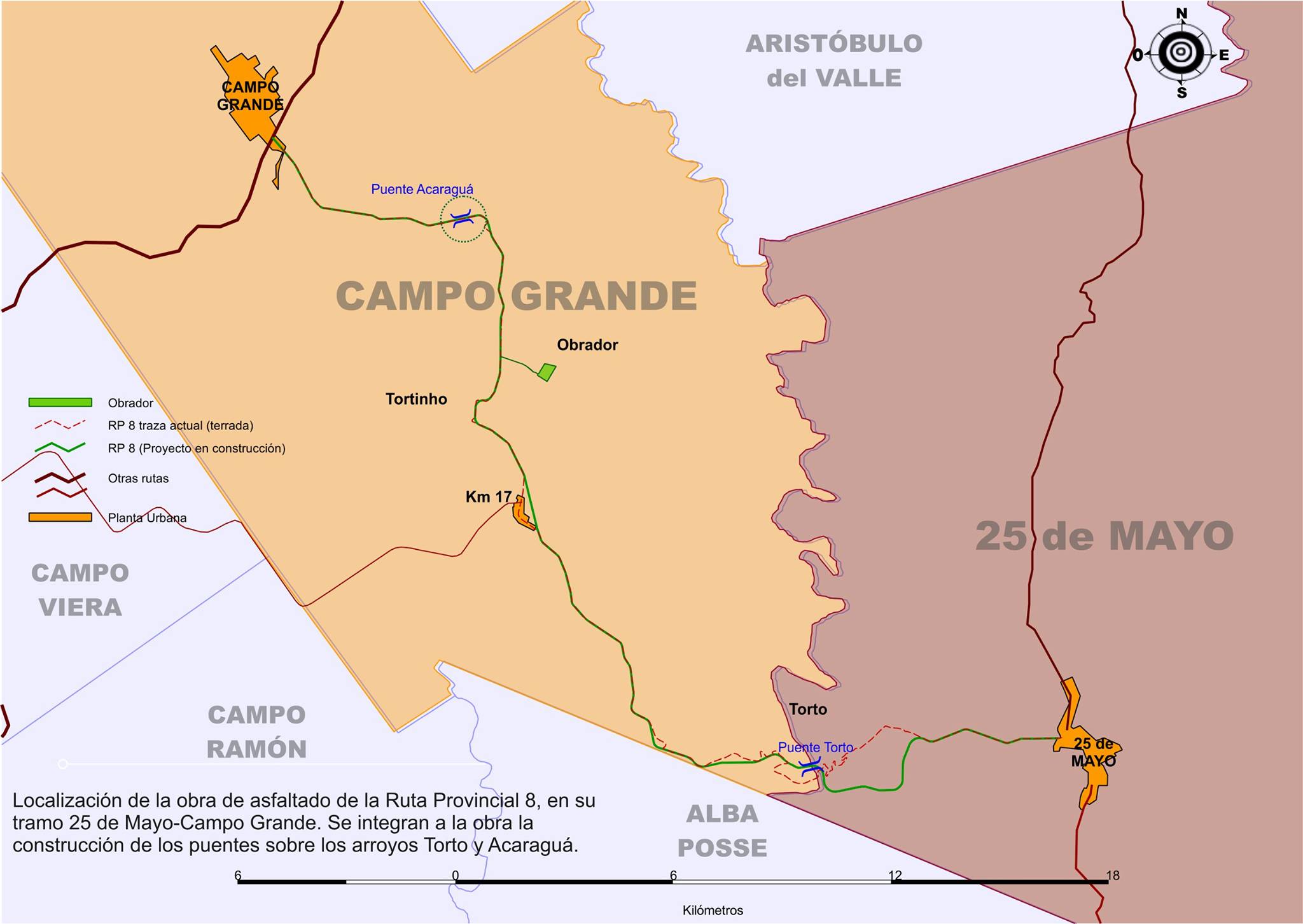 La conexión vial asfaltada entre las localidades de Campo Grande y 25 de Mayo es una realidad. El dato surge al haberse completado el último tramo de base asfáltica de la flamante RP Nº 8, enlace vial de 36 kilómetros de longitud que une ambas localidades ubicadas en la Región Central de Misiones.