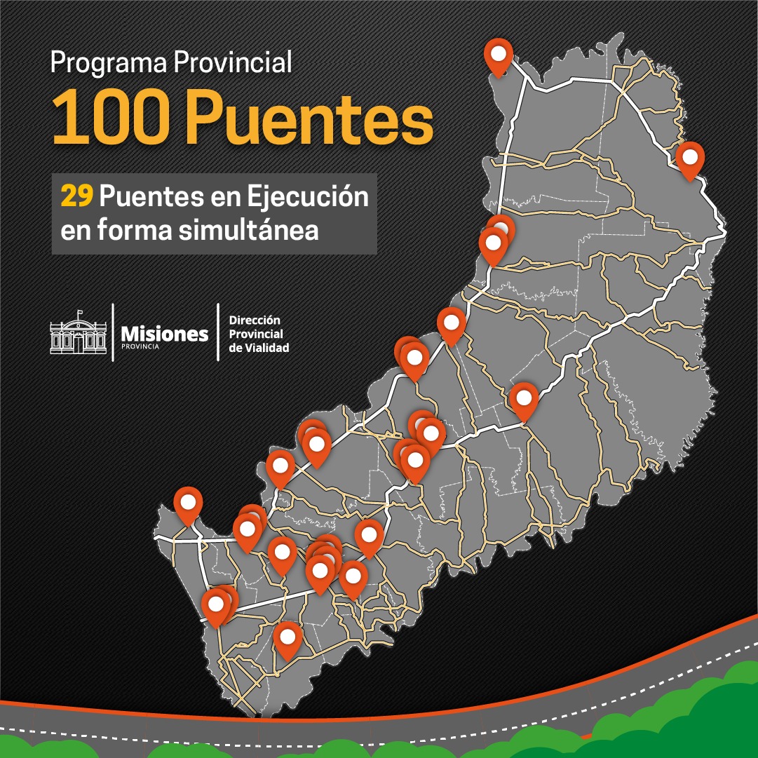 Por medio del Programa 100 Puentes, que se encuentra en la tercera etapa desde su implementación, el organismo provincial tiene en construcción en forma simultánea 29 pasos en las localidades de Cerro Corá, San José, Santo Pipó, San Ignacio, Guaraní, Gobernador López, Leandro N. Alem, Garuhapé, Aristóbulo del Valle, Campo Grande, San Vicente, Puerto Iguazú, San Antonio, Posadas, Eldorado, Santa María y Bernardo de Irigoyen.