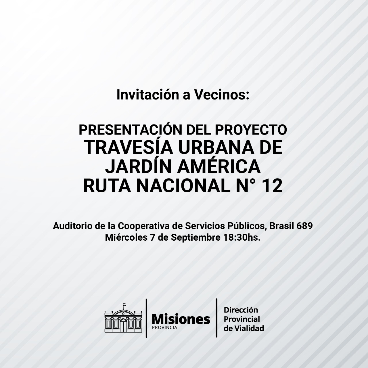 La Dirección Provincial de Vialidad invita a los vecinos y vecinas de Jardín América a participar de una reunión en la que se presentará el Proyecto de la Travesía Urbana, sobre la Ruta Nacional N° 12. El encuentro se realizará el 7 de septiembre de 2022, a las 18:30 horas en el Auditorio de la Cooperativa de Servicios Públicos de Jardín América, ubicada en calle Brasil 689.