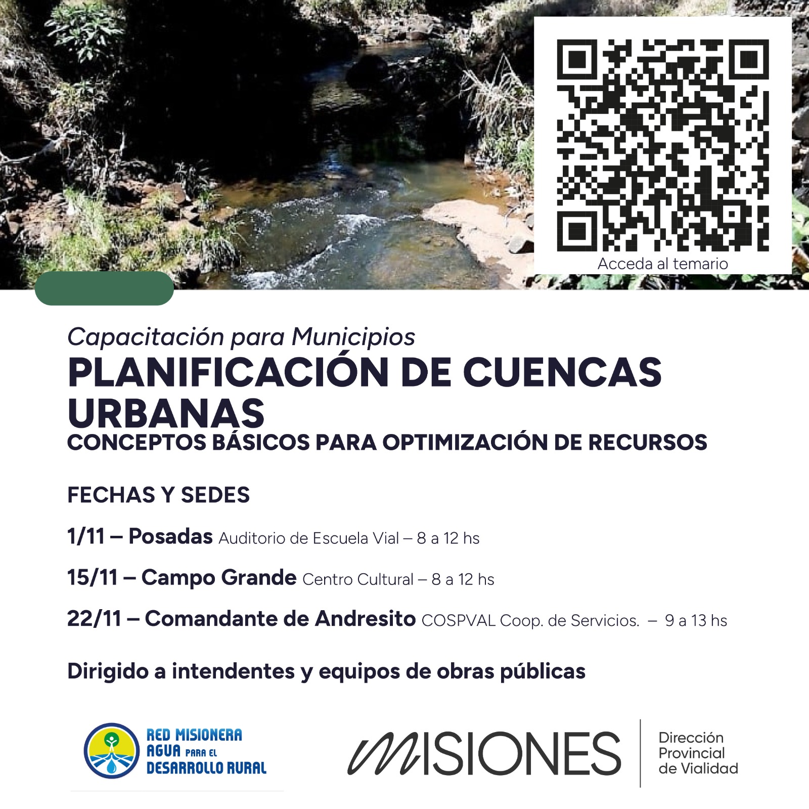 La Dirección Provincial de Vialidad (DPV) junto a la Red Misionera del Agua para el Desarrollo Rural invitan a participar de la charla PLANIFICACIÓN DE CUENCAS URBANAS: CONCEPTOS BÁSICOS PARA OPTIMIZACIÓN DE RECURSOS.
